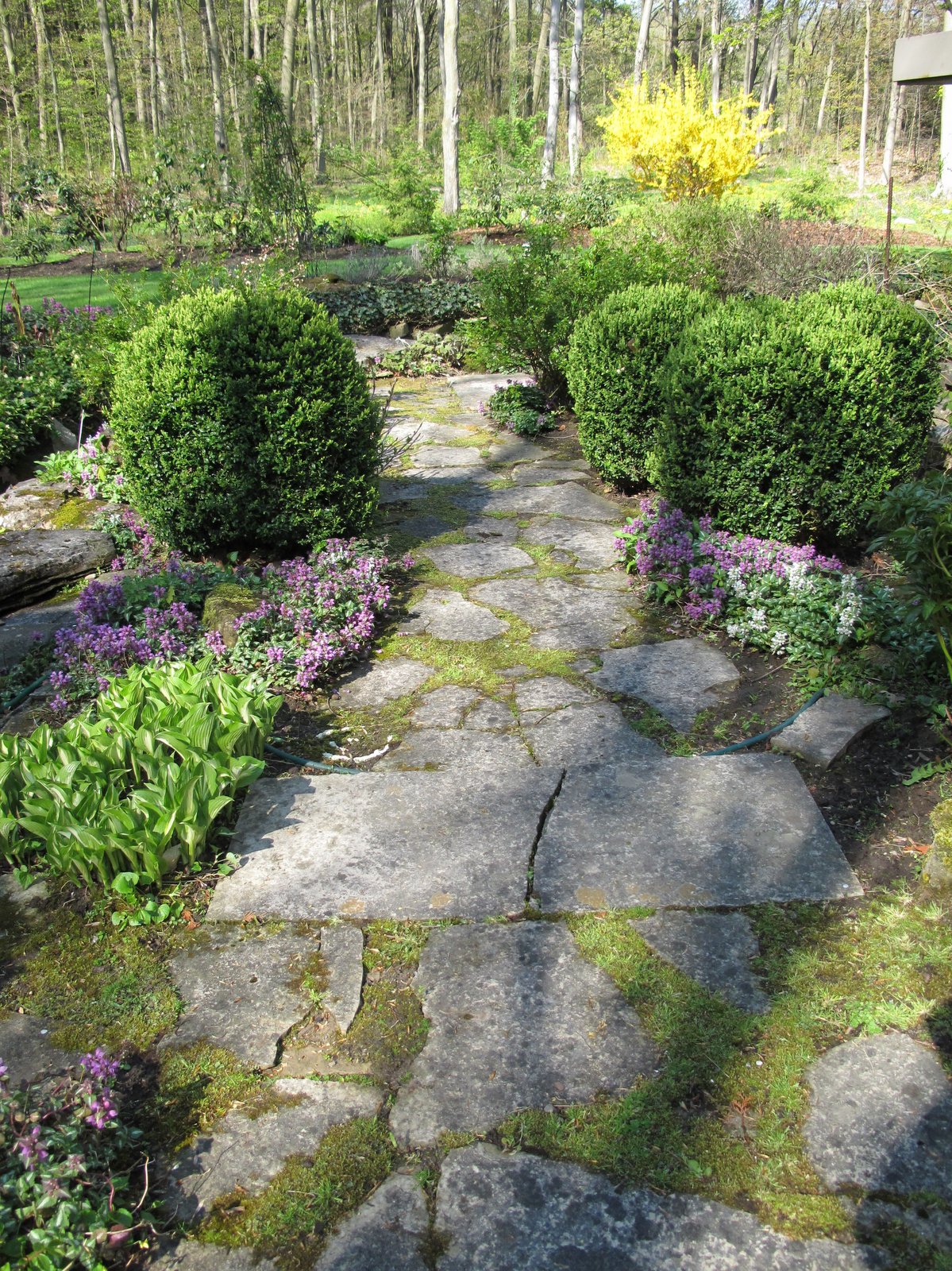 The lower terrace, just yesterday..... some self seeded lamium, and shoots of hosta amidst the box, and off in the distance, the yellow forsythia, trumpeting the arrival of Spring!